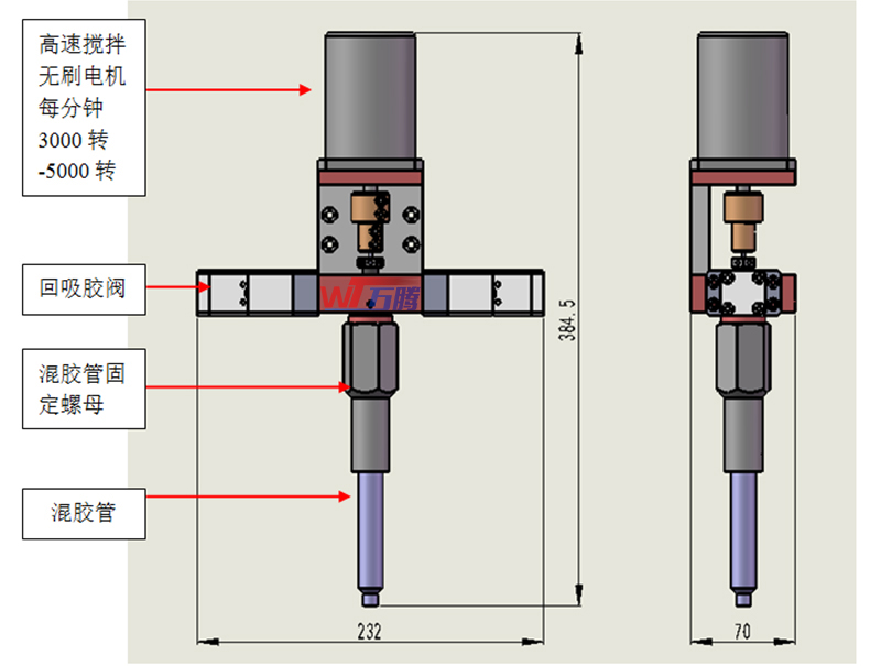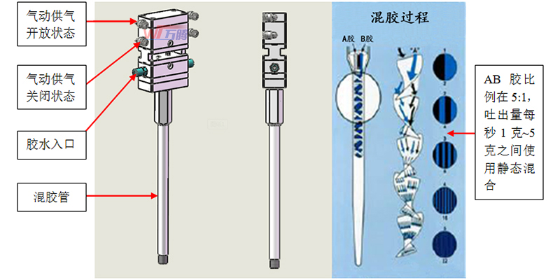 動態混合是當兩個組份的膠經過動態混合管,通過高速馬達帶動混合芯快速的旋轉,從而使膠水充分攪拌,混膠均勻充分。