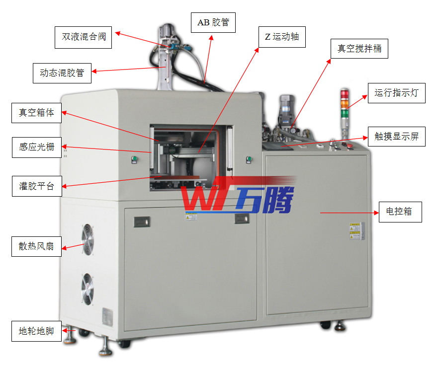 真空環境覆蓋整個三軸運動系統,實現真空環境下自動灌膠作業,大功率真空泵滿足脫泡功能。