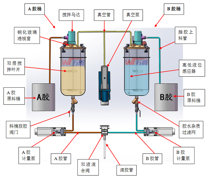 實現膠水持續自動供膠,配備兩個50L不銹鋼儲料桶,兩組計量泵,AB膠分別獨立儲放和供膠,A料桶攪拌等功能。